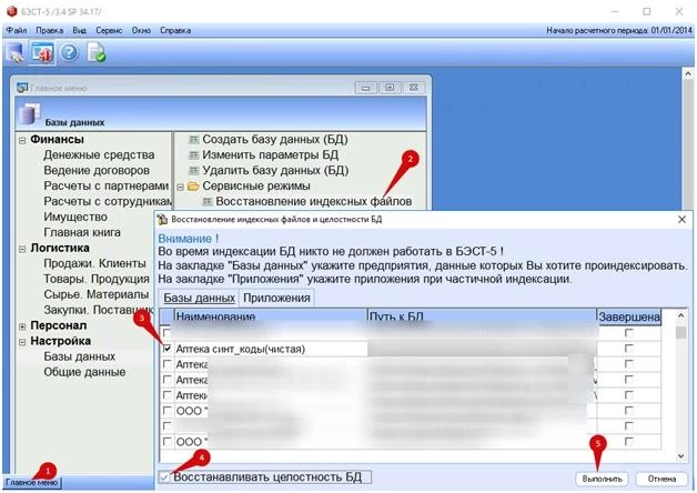 2. Следуем по пути: БЭСТ-5.Аптека \ Главное меню \ Настройка \ Базы данных \ Сервисные режимы \ Восстановление индексных файлов.